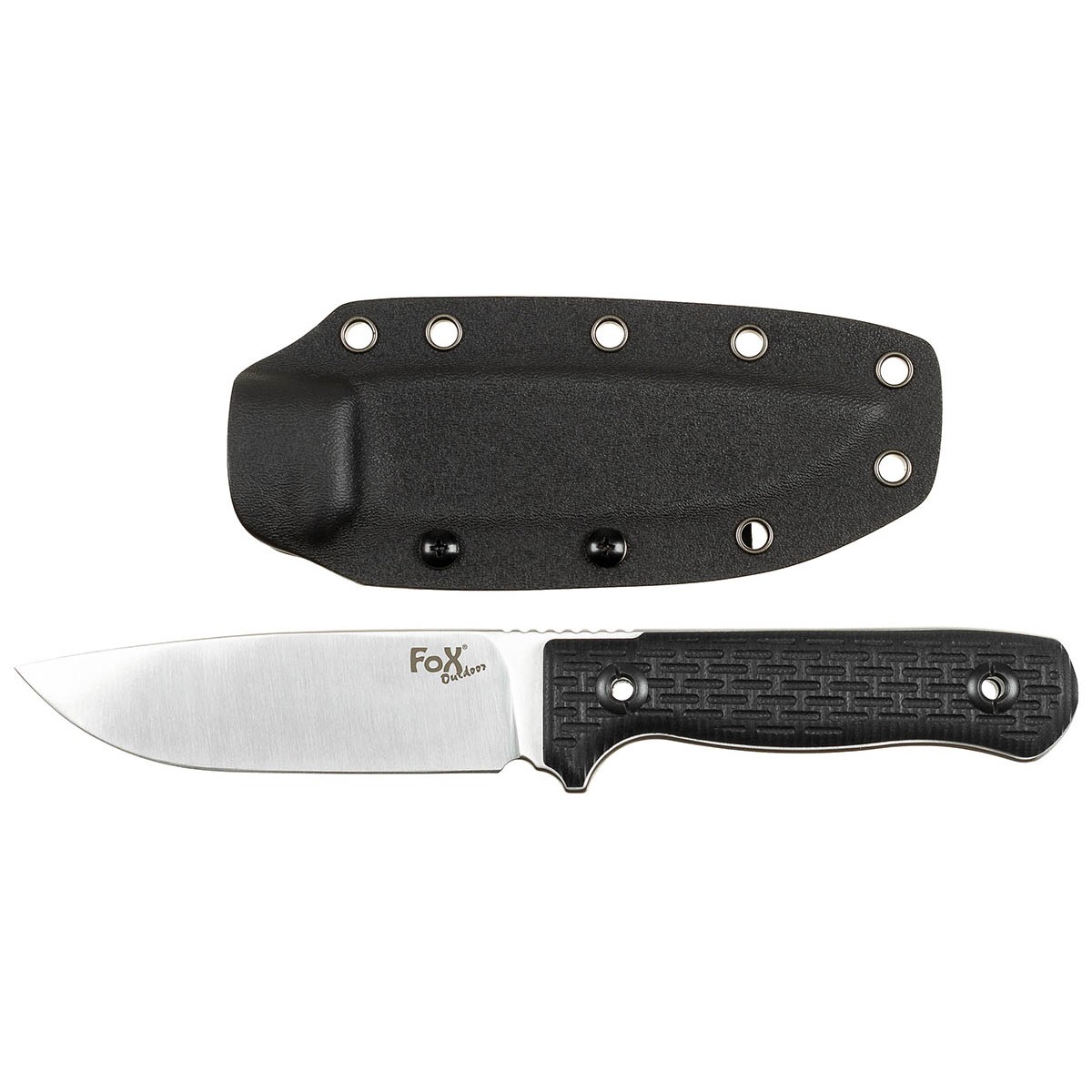 construção full tang lâmina em aço 3Cr13MoV com fio liso e apoio de polegar ranhurado alça de formato ergonômico com removível, escamas G10 texturizadas e rebites ocos Bainha Kydex com clipe de cinto removível Comprimento total: aprox. 24,5 centímetros Lâmina: aprox. 12 cm Espessura da lâmina: aprox. 5,5mm Peso da faca: aprox. 280g Peso com bainha: aprox. 390g